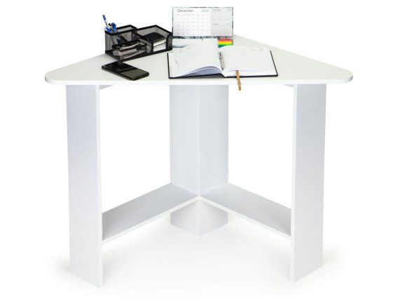 Biurko narożne to idealne rozwiązanie w sytuacji, kiedy chcemy umeblować małe pomieszczenie. Dzięki temu, że blat i konstrukcja biurka mają kształt trójkąta, mebel idealnie wpasuje się w narożnik pokoju, biura, czy recepcji. W jego dolnej części znajdują się dwie półki, odpowiednie do postawienia na nich komputera.