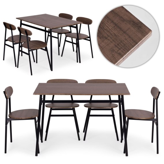- Blat stołu i elementy krzeseł zostały wykonane z płyty MDF pokrytej okleiną, co zapewnia łatwość czyszczenia oraz odporność na codzienne użytkowanie. To rozwiązanie gwarantujące estetykę i trwałość w jednym.